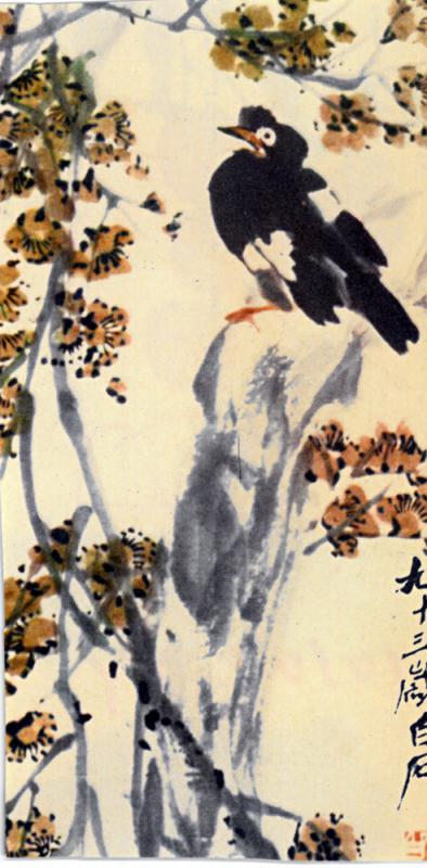 他繪八哥的另一幅畫,自題四句詩:「太平籬矮無人越,八哥見羊呼盜竊。往日今朝難概論,人人忌諱休偏說。」他自己註釋:「余少時養一八哥,能言;見牛羊大呼曰:『對門屋強盜來也』雲雲。」那時因與八哥日夕相伴,對其形神瞭如指掌;年老時印象猶深,故能筆簡意賅,活靈活現,更蘊涵永不磨滅的鄉情。
