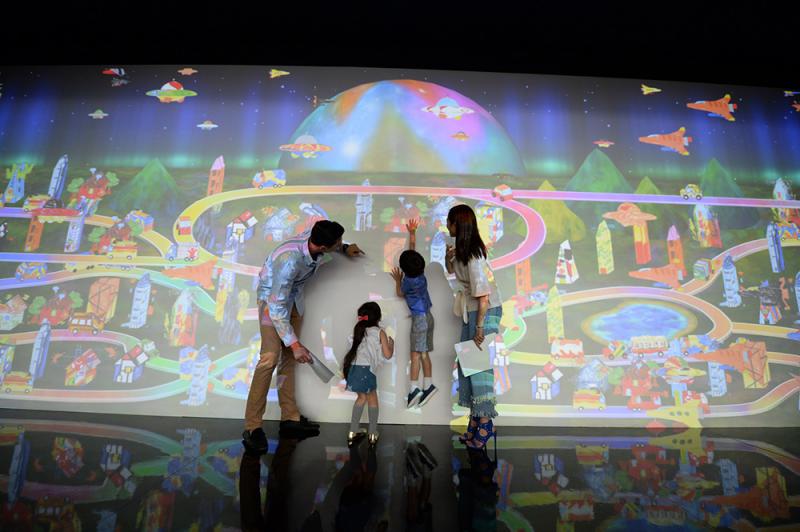 是次到港展出的是teamLab新作《Sketch Town》,將紙上意念生動地轉化為巨型數碼大屏幕上活潑的動畫,集合所有參與者的力量,建立一個3D虛擬城鎮。大人和小朋友們可以發揮創意,在圖紙上用蠟筆畫上喜愛的顏色和圖案,然後通過掃描,將親手設計的飛機、汽車和太空飛船等擺入社區,顯示在屏幕上面。