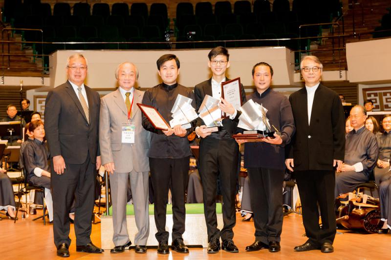 圖左起:香港中樂團理事會主席李偉強、評委會主席陳澄雄、冠軍廖元鈺、亞軍曾維庸、季軍鄭丞泰、香港中樂團藝術總監閻惠昌/香港中樂團供圖