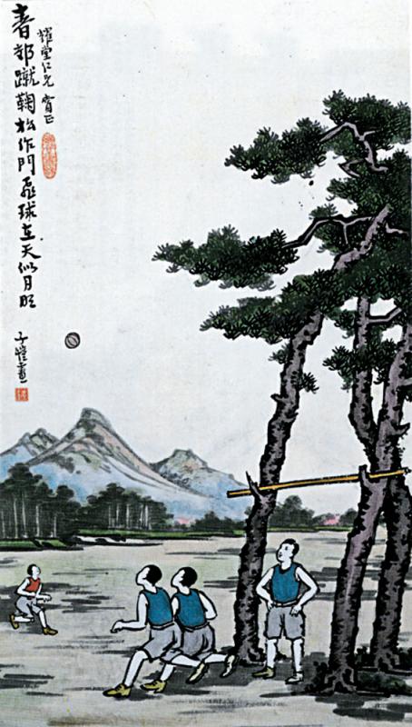 豐子愷這幅《蹴鞠圖》,使筆者不禁要略談我國「蹴鞠」的來源。《後漢書》指的「蹴鞠之戲」,據傳言為黃帝所作,但亦有謂起於戰國時代,又稱「蹋鞠」。劉向《別錄》說是「兵埶也,所以講武知有材也」,乃古代軍中以踢足球作為習武之戲。曾見河南南陽出土的蹴鞠畫像石,證實為東漢時所作,習武者以踢球作鍛煉。此文物足以證明足球運動始於中國。東漢是屆於公元廿五年至二二○年。另外,河南登封啟母闕,發現東漢時《蹴鞠圖》浮雕附拓本,球員騰空飛身、舉足踢球,姿勢美妙無比,栩栩如生。