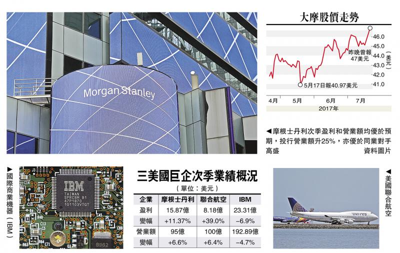 美國企業進入業績公布期,盈利表現各有參差。美國第六大銀行摩根士丹利公布次季盈利及營業額均超過預期;惟國際商業機器(IBM)次季營業額下跌4.7%,為連續二十一個季度按年倒退,反映這家106年歷史的老牌科技公司,仍未能成功扭轉弱勢。美股方面,道指周三早段反覆靠穩;納指曾升32點,報6376點,再創新高;標指亦曾升4點,至2465點歷史高位。Facebook和亞馬遜股價均創新高。/大公報記者 鄭芸央