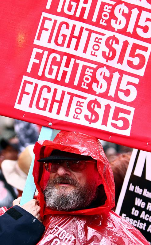 圖:美國人工加得少,難怪購物意欲如此低;圖為早前美國示威者要求提高最低工資/資料圖片