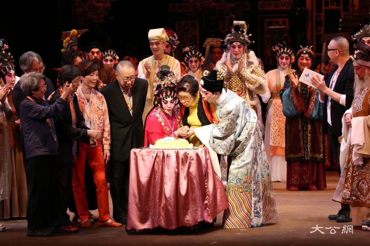 大公網7月20日訊(陳惠芳)《蝶影紅梨記》在文化中心演出如火如荼之際,昨晚(7月19日)謝幕時,因阿嗲梅雪詩今天生日(西曆7月20日)而增添高潮。主辦單位突然奏出生日歌,並推出一個大蛋糕到白雪(仙姐)、陳寶珠及阿嗲前面;阿嗲不知道蛋糕是為她而設,一臉愕然。既驚且喜的她,隨即與仙姐及寶珠深情擁抱,並一起吹蠟燭及切生日蛋糕,更向各人握手致謝,場面既溫馨又感動。