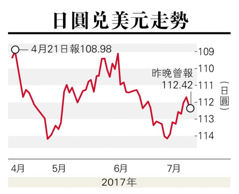 日圓方面,日圓兌美元跌0.64%,低見112.42水平,每百日圓兌6.95港元。