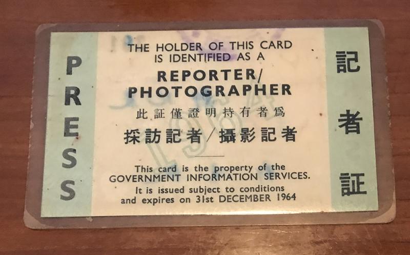 圖:港英政府新聞處發的記者證,時為一九六四年 作者供圖