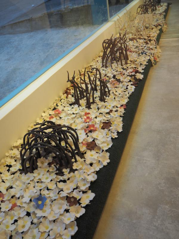於藝廊落地玻璃上展示的陶藝作品,來自趙彩虹的《花問》:陶製的茶花嵌在用銅線做成的樹枝上,由上垂下,與鏡中反射的茶花之景連成一片,頗具美感。趙彩虹介紹,這幅作品共使用逾一千九百七十朵陶製茶花、一百條銅線,之所以取名《花問》,是希望人們可以有很多想像。她說:「平日行山時看到山間沿路的茶花,我便有了靈感。我認為茶花能夠代表香港的大自然之美,帶來美好的感覺。花開花謝是一個循環,生生不息而充滿生命力。」趙彩虹還告訴記者,她與鄺陳勵平、關美嬋二人是多年的朋友,一年前應藝廊館長邀請,特為此次展出創造一系列陶瓷新作。