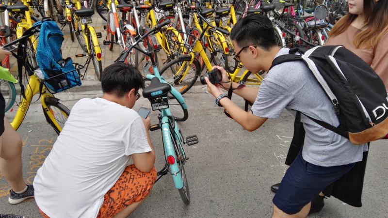 回籠觀和霍營是北京北城人流量非常大的軌道交通站點,附近超大規模社區裏的幾十萬居民,有很多已經習慣了用共用單車解決從家到地鐵站的通勤。每天上班高峰一過,這裏就形成了好幾片「單車海」。