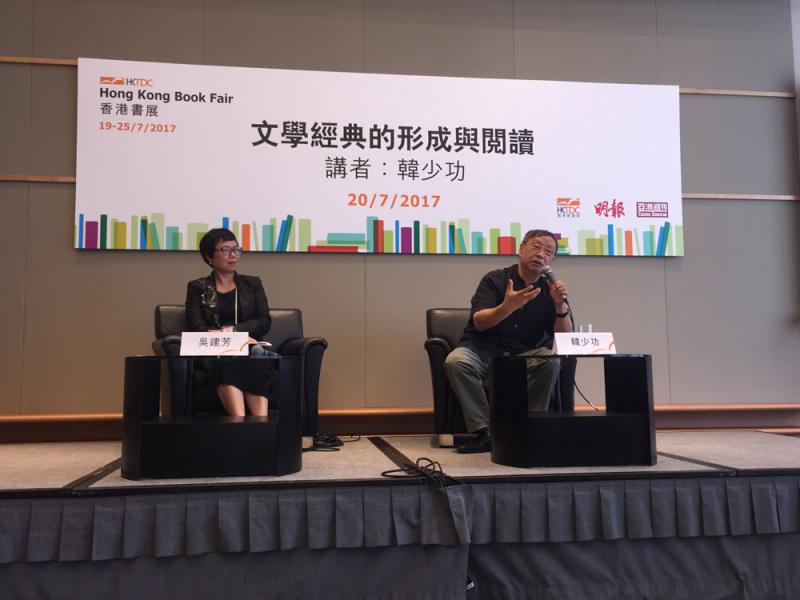 圖:吳建芳(左)主持韓少功主講「文學經典的形成與閱讀」講座現場/大公報記者王豐鈴攝