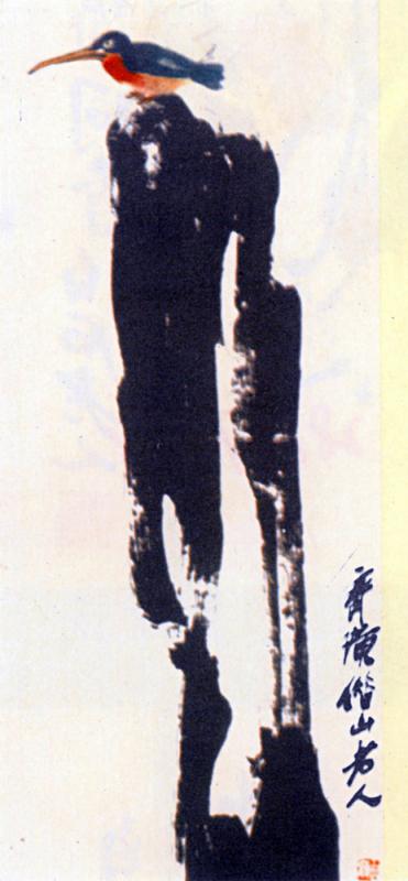 附圖為齊璜(白石、借山翁)水墨設色畫《危石翠鳥》(局部),現藏北京畫苑。高高危石,筆酣墨飽,力健豪雄,簡拙有勢。喙長色鮮的「釣魚郎」翠鳥,獨佇靜候,形成強烈對比,結合寫意與寫實於一爐,以形寫神。老人這種「為百鳥張神」的畫法,自認深受徐渭、八大山人、石濤(大滌子)和吳昌碩的影響。