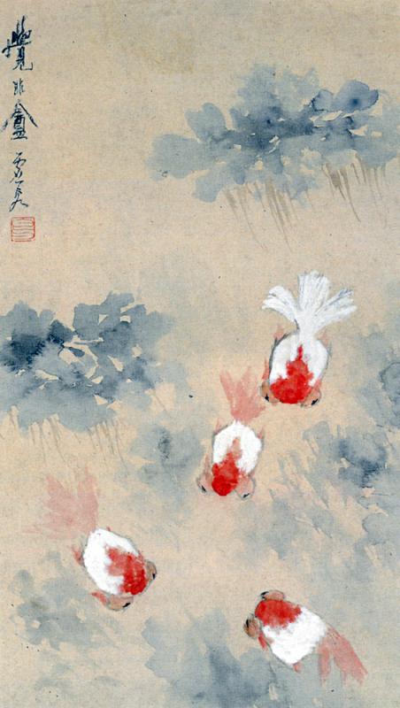 清代時,才逐漸培育出不同品種的美麗金魚;但是擅長繪金魚而又寫意者寥寥。我國以游魚作畫的主題,可始於五代;直至宋徽宗趙佶時,《宣和畫譜》才出現其《魚藻圖》,但並非繪金魚。直至明代,金鯽魚漸漸衍變為金魚。宣德四年始出現「凸目金魚圖」(與虛谷筆下的「蛋種」短尾「龍睛」紅頭仍有別),乃皇帝親繪。曾見坊間一幀絹本彩繪「凸眼繡球金魚圖」,畫商竟然誑稱「宋代名家所作罕品」。唉,宋朝時怎會有這個品種金魚呢?況且,贋品用現代機器製的絹(經染色造舊),與宋人繪畫用者絹質大相徑庭。