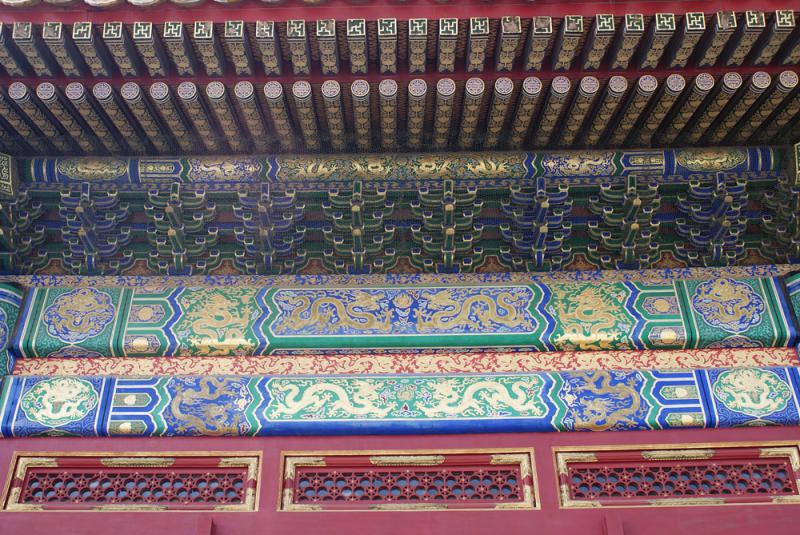 宮殿建築的色彩艷麗、富有視覺衝擊力,色調安排也十分考究,簷下的樑枋彩畫特意採用青綠為主的冷色調,以協調簷下的陰影和建築外形的塑造,但也有例外的情況,比如午門。
