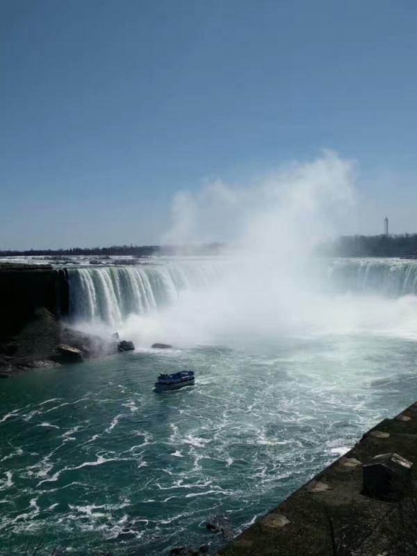 二○○六年,我們第一次來多倫多,也是第一次遊覽尼亞加拉大瀑布。記得那次從幾里之外就聽到瀑布的轟鳴聲,有山雨欲來之勢,使人心靈震撼。進入瀑布區,沿着大道前行,遠遠就感到有細雨般的水珠落在頭上、身上,原來是瀑布濺出來的水霧。這時眼前已出現淺綠色的半環形(馬蹄形)巨大水流,似銀河傾瀉,形成氣勢磅礴的大瀑布,頓時腦海中浮現出李白的詩句:「飛流直下三千尺,疑是銀河落九天。」那次我們乘遊船向着瀑布正前方行進,眾多遊客都穿着發給的藍色雨衣,船行至湖中間,似暴風驟雨突然襲來,原來我們已臨近瀑布落下後形成的巨大水霧前面,我們的雨衣濕透,相機鏡頭全被水霧遮蓋,無法將這一壯麗景觀攝入,留下最大遺憾。