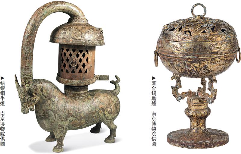 自距今四千年前夏代起進入青銅時代的中國青銅器鑄造,是中國最古老的傳統工藝之一,發展至漢代時,已一反先秦時期的附屬豪門貴族與寓禮於器,轉為貼近平民,向日常實用器轉變,新出現和在原有基礎上發展起來的器種有燈、熏爐、熨斗、漏壺、鏡、硯滴等,滲透到社會生活的各個方面,創新裝飾工藝,既實用又美觀。南京博物院館藏的東漢錯銀銅牛燈、西漢鎏金銅熏爐和東漢鎏金鑲嵌獸形銅硯盒,代表着漢代青銅藝術的巔峰。/大公報記者 陳 旻 文、圖