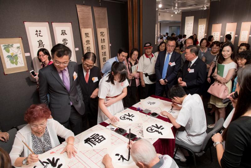 剪綵儀式結束後,一眾嘉賓參觀長者與學生即席揮毫。示範長者陳陽瑞和江曼詩,來自新界西長者學苑聯網,參加長者學苑書法班已有十年。當中陳陽瑞(陳伯)年屆八十,即席揮毫顯功架,下筆雄渾有力,讓嘉賓及在場人士拍手稱讚。參與示範的還有明儒長者學苑的合作學校香港中國婦女會中學莊駿圻和郭詠欣同學,郭同學表示,是次活動提供難得機會,與老友記切磋交流書法心得,獲益良多。