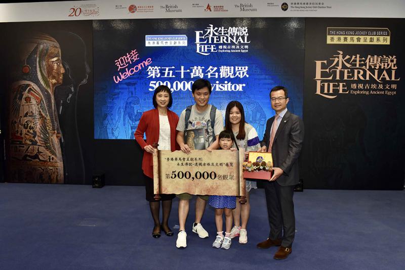 為了歡迎第五十萬名觀眾,馬會慈善及社區事務執行總監張亮與康樂及文化事務署署長李美嫦昨天到場歡迎這位觀眾─九歲小朋友蔡韻希,她與家人一起參觀展覽。蔡韻希表示很高興可以看見木乃伊,而媽媽蔡太希望馬會可以多捐助同類的展覽,因為當中的展品很珍貴,家長可以帶小朋友近距離接觸,從而增長知識,比單看故事書有效。