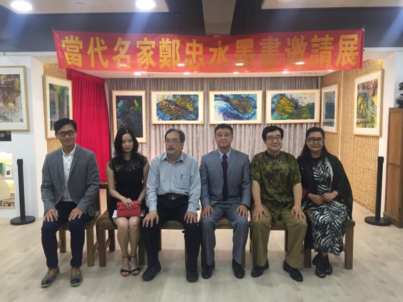 ◀畫家鄭忠(左四)、獨立策展人李迪斌(右二)、新華文化教育基金會理事會主席尹健文(左三)等嘉賓出席畫展開幕禮 /大公報記者 王豐鈴攝
