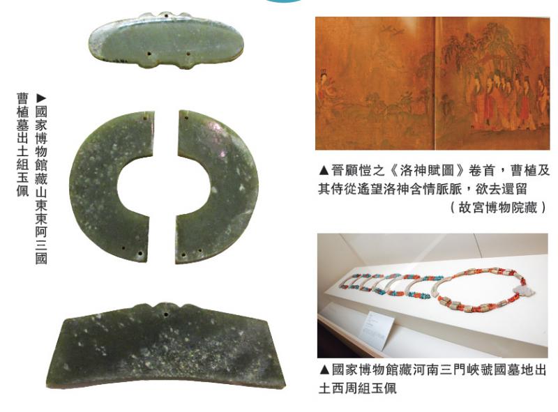 中國國家博物館藏三國曹植(公元一九二至二三二年)青玉佩,是一九五一年山東省東阿縣曹植墓出土文物。事情巧合的是,在曹植的千古名篇《洛神賦》裏,他與自己仰慕的洛神的定情之物,正是自己身上的一件玉佩。這說明玉佩是曹植生前最珍愛的東西。故宮博物院藏傳世名畫——晉顧愷之《洛神賦圖》,也特別描繪了二人舉起佩玉的情景。名器、名篇、名畫,三者相輔相成,為我們還原了魏晉六朝那唯美時代的風流人物,令我們得見生活在一千八百年前,「才高八斗」的曹植的風神才調。