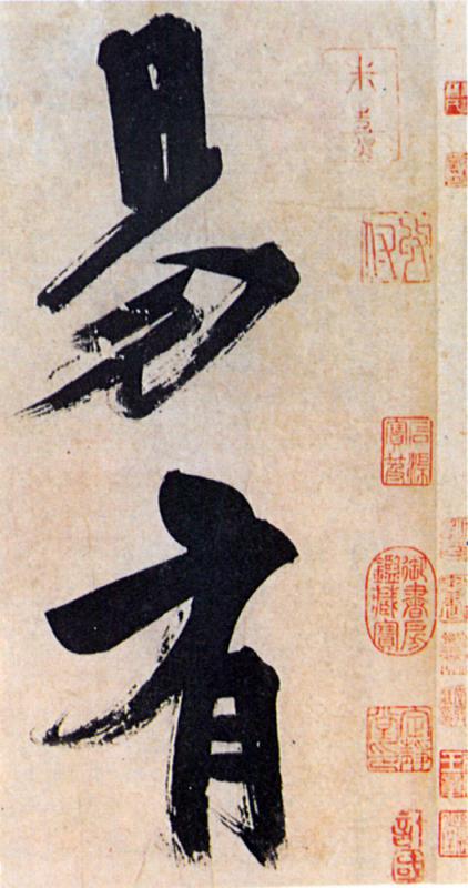 附圖為朱熹所書易繫辭冊中二字「易有」。觀微知著,可見其筆勢雄健、乾濕有度,風格蒼鬱沉厚、典雅奇偉;尤其是大字,他最擅長。蓋朱熹師法唐代顏真卿,曾臨池不輟。顏體幾乎全屬中鋒運筆,遒勁渾然,有篆籀筆意,絕去姿媚之氣;如朱長文形容為「點如墜石,畫(劃)如夏雲,鈎如屈金,戈如發弩,縱橫有象,低昂有志」。朱熹得其精粹,融會為己用。可惜傳世真跡大多失傳,僅存斷章殘篇。