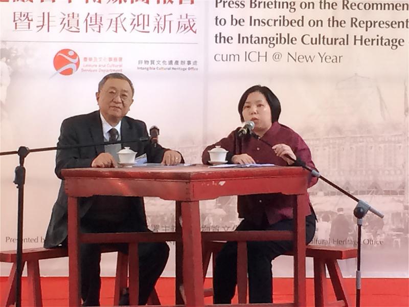 圖:非遺諮詢委員會主席鄭培凱(左)與非遺辦事處總監何詠思於今年二月十二日會見傳媒介紹獲推薦的十項香港非遺代表作名錄建議名單/大公報資料圖片