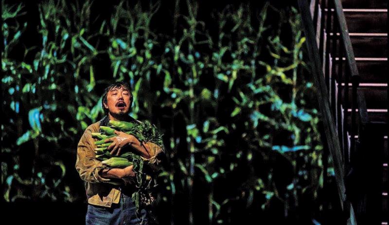 台上的電視機於第三幕播出漂亮的粟米畫面,而Halie則於劇首末皆用了體貼、較輕鬆的語氣(畫外音)對Dodge說話,這兩個編排顯然象徵美好的事物、家庭已成過去或幻象,跟Dodge禿頭上的血色傷痕構成鮮明、殘酷的對比。 (香港話劇團供圖)