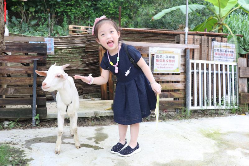入門口未見農莊主人Raymond,就先聽到羊叫,比比一見有客到,就興奮地走出羊欄迎接,果然是當之無愧的「代言羊」。四個月大的比比最鍾意同小朋友玩,四歲的Haylea行近伸手摸牠,牠亦乖乖地望住Haylea,似是在說「不如買份零食餵下我啦?」Raymond早有準備,出來接人時已拿來飼料給記者一行人餵羊及影相。