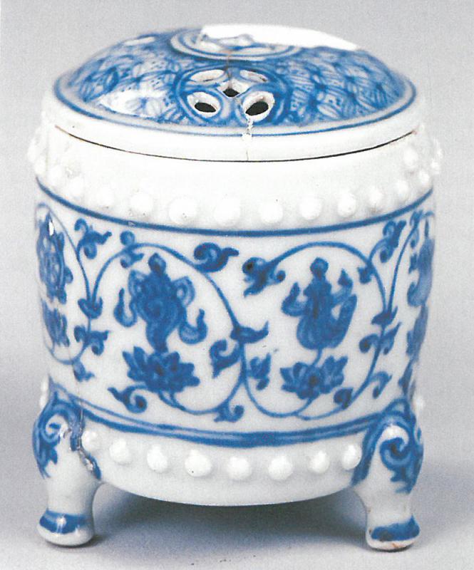 附圖成化青花鼓形熏,紋飾方面也與別不同,繪「八寶」紋,襯以纏枝蓮紋。「八寶」紋亦稱「雜寶」紋飾,元代瓷器已有。通常,於肩、脛部位變形蓮瓣內,繪各式「珍寶」,像銀錠、犀角、法螺、火輪、火珠、珊瑚、火焰和雙錢之類,無固定格式或排序。