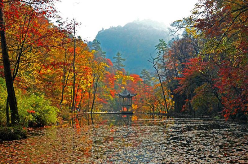 黎坪的秋葉,飄落的姿態也優雅至極。在着名景點紅塵峽,我們正在欣賞飛瀑碧潭、飛珠濺玉,忽見一大群蝴蝶自遠方飛來,在峽谷間翩翩起舞,優雅動人。深秋時節,哪來的這麼多蝴蝶?我正自疑惑間,有眼尖的同伴終於看出,哪裏是什麼蝴蝶呀,那明明就是落葉。奇特的是,它們並不像普通秋葉一樣飄落而下,而是長久地在空中輕舞飛揚,如同蝴蝶振翅起舞一般,盡情展示它們的美麗。然後才緩緩落在地上、落在水面。五彩繽紛的樹葉飄落在大地上,把大地點綴成巨幅畫卷;飄盪在清澈的溪水中,溪水變成流動的畫卷。落葉,那不是生命的枯萎,而是生命的另一種更燦爛的形態。