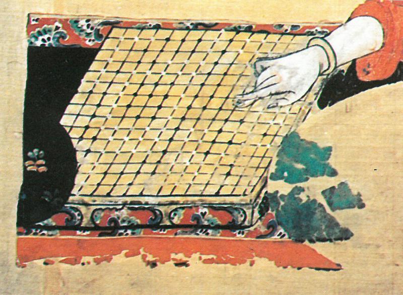 附圖為唐代絹畫《弈棋圖》(一稱《圍棋仕女圖》)(局部),一九七二年新疆「吐魯番」阿斯塔那出土;雖屬殘片,但可能是唐代絲綢之路遺物,而且可見唐代時仕女同樣喜愛下圍棋,更清晰可見當時(約為唐玄宗前後)圍棋盤的真貌。另有《生活圖》,足以證明盛唐圍棋風氣影響所及,藉絲路傳揚開去。