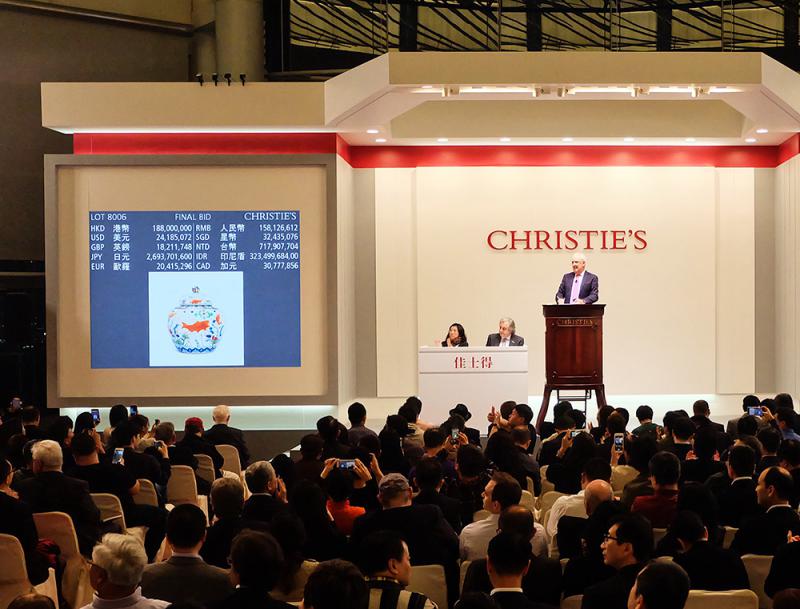 第六個登場的「明嘉靖五彩魚藻紋蓋罐(六字楷書款)」,以一億二千萬港元起拍,每口承價一千萬,價格升至一億七千萬時,佳士得兩位高層魏蔚、張丁元各自的電話委託客戶開始了拉鋸戰,魏蔚代表客戶出價一億八千萬、張丁元的電話另一端就追加五百萬,魏蔚這邊向拍賣師請示出價一億八千八百萬,拍賣師表示允許並開玩笑稱這組數字不錯都幾幸運,隨即場內陷入短暫僵持,其間拍賣師數次提示當前標價,還幽默地對張丁元說「talk to me, Eric」,在拍賣師再三追問下對方終於表示放棄競標。此件拍品最終由魏蔚代表出價的買家以一億八千八百萬港元競得,連佣金二億一千三百八十五萬港元成交。更多資訊可瀏覽佳士得網址www.christies.com,或關注微博「佳士得國際」及微信官方帳號「Christies1766」。
