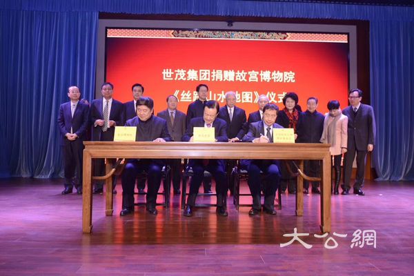 從左到右:故宮博物院院長單霽翔、世茂集團董事局主席許榮茂、北京故宮文化保護基金會理事長李季代表三方簽收捐贈協議。