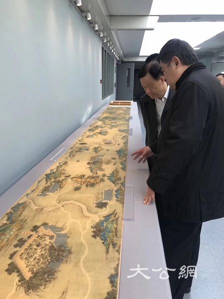 單霽翔(前)向許榮茂講解《絲路山水地圖》。