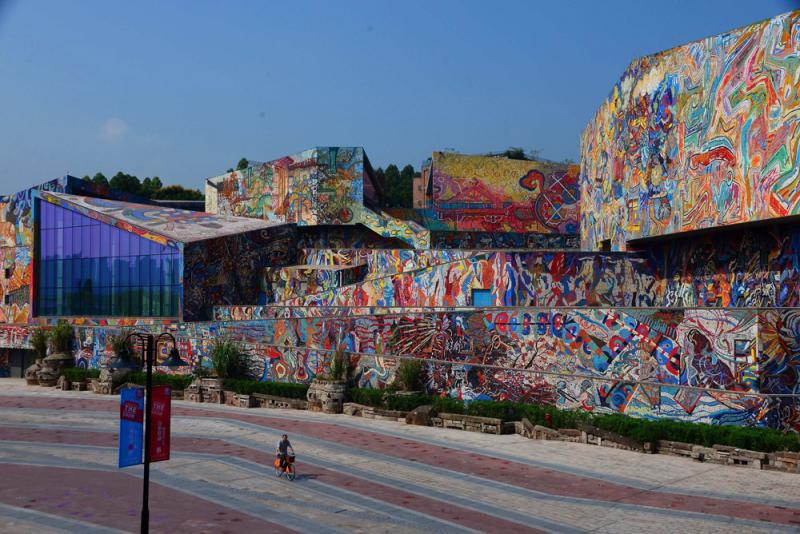 從羅中立美術館走出來,沒多久就能看到一個廣場,它是川美廣場。在看到它的一瞬間,我在心裏「哇」了一下。這個階梯廣場相當闊大,像一個圓形劇院,自下仰望,不規則造型的台階錯落有致,一層一層逐次遞升。廣場中央豎着把金色的大尺規,三三兩兩的學生、遊客閒坐在台階上休憩,畫面非常具有藝術感。而更震撼的還在後面。當我拾階而上,自上俯瞰,驚訝地發現整個廣場變臉了!對,就像川劇中的變臉。每層台階的背後,都用廢棄的彩色瓷片鑲了圖案。因廣場依山而建,地勢漸高,從下往上只能看到一層層的弧形石頭台階,只有走上去,自上往下俯視,才能看到美麗的彩瓷圖案。一座廣場,兩張面孔,不同的風格,不同的味道,真是天斧神工,創意無限,廢棄的瓷片在川美得到了最大化利用。