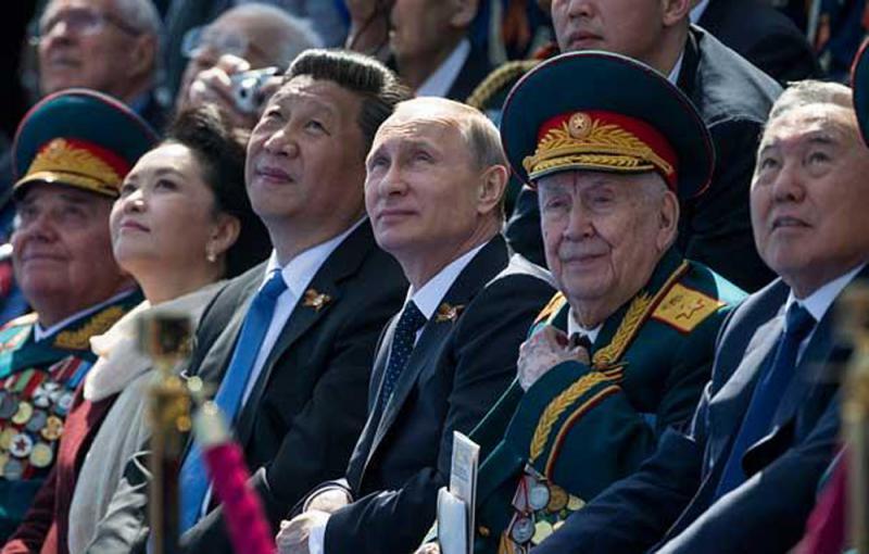 圖:二○一五年五月九日上午,紀念偉大衛國戰爭勝利七十周年閱兵式,在莫斯科紅場舉行。左二起:彭麗媛、習近平主席、普京總統、加列耶夫大將、哈薩克斯坦總統納扎爾巴耶夫