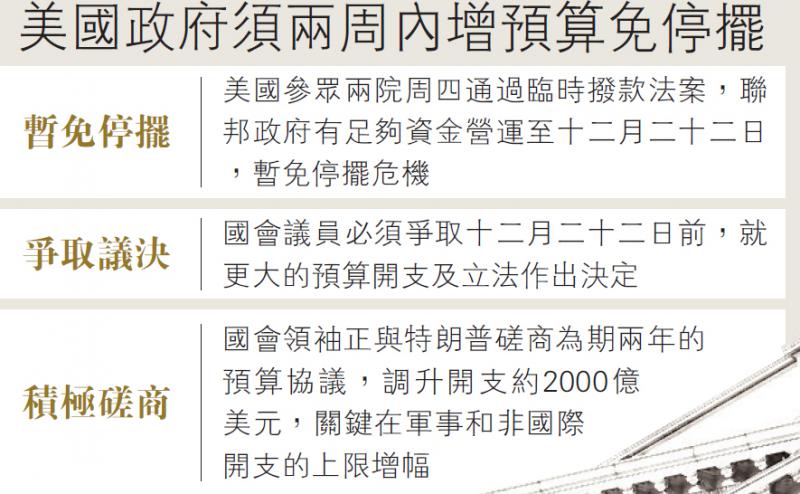 美國國會於周四通過決議,通過臨時的撥款法案,延長聯邦政府的預算撥款兩星期,避免美國政府於今年十二月九日陷入「停擺」的危機;不過,國會議員仍然需要在十二月二十二日(農曆冬至)之前,解決更大的開支和立法問題。有分析指出,雖然美國國會達成臨時撥款法案,惟共和、民主兩黨的分歧仍大,年底前達成整份財政預算上限共識還是會遇上阻力。\大公報記者 鄭芸央