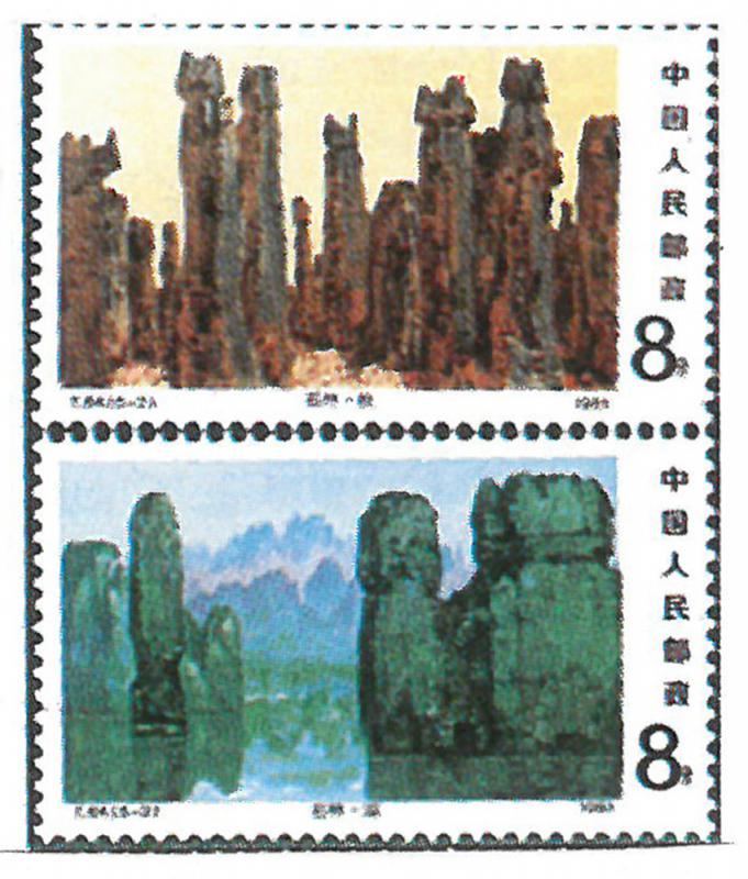 附圖為其中兩枚八分票。石林位於雲南昆明東南約一百廿六公里廣闊而微微起伏的高原上。親臨觀賞,可見峭石崢嶸,突兀排空如插天,點點群群若雨後春筍,破土而出;峰峰攢聚,似劍戟穿雲,入秋更如黛亦如鐵,莽莽蒼蒼,森立成林;正是「高山為谷谷為陵」(趙樸初詩句)。石林不但壘石而成,拔地擎天,異境天開,尋且挺立的石柱奇形詭質,怪狀嶙峋,千姿百態。有些像大蘑菇或靈芝,有些肖人形或鳥獸,甚至是飄飄欲飛的仙女;也有些像猙獰妖怪,或千隊萬騎;另一些則如荷花佇立,或利劍刺蒼穹,或寶塔高聳。它們約於二億多年前古生代二疊紀,由汪洋大海沉積的厚厚石灰岩,經中生代燕山運動,漸漸隆起而成,乃典型的「岩溶(喀斯特)地貌」;奇峰怪石皆「天然去雕飾」。摩岩《石林歌》有詠:「危磴高峰真鬼斧,球琳琅玕奚足數。」