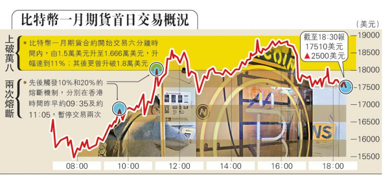比特幣期貨在華爾街登陸,芝加哥期權交易所由美國東岸周日晚(香港時間昨早七時)開始,進行比特幣期貨交易,雖然芝加哥期權交易所在事前預計最初的成交不會太多,惟首個交易日開市一個小時,成交量已經接近600份合約,價格亦大幅波動。根據該期權交易所數據顯示,比特幣一月期貨合約開始交易六分鐘時間內,便由1.5萬美元升至1.666萬美元,升幅達到11%;其後更升穿1.8萬美元,高見1.87萬美元,並先後觸發10%和20%的熔斷機制,分別在香港時間早上約九時三十五分及早上約十一時零五分,暫停交易兩次。