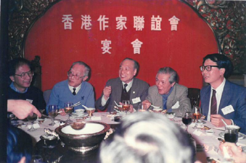 圖:一九九一年四月五日作聯宴會,左起:阿濃、余光中、曾敏之、胡菊人、黃維樑/ 作聯供圖