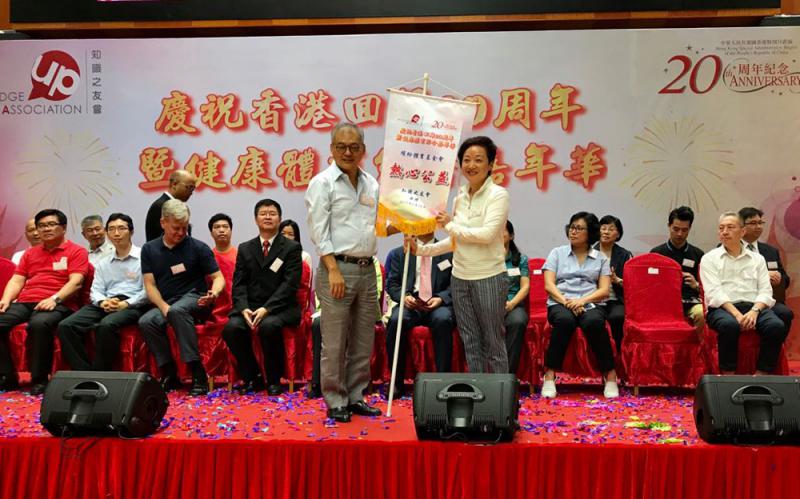 圖:「繽紛體育基金會」早前贊助「慶祝香港回歸20周年暨健康體育綜合嘉年華」,基金主席周琳(右)獲主辦單位致送感謝旗