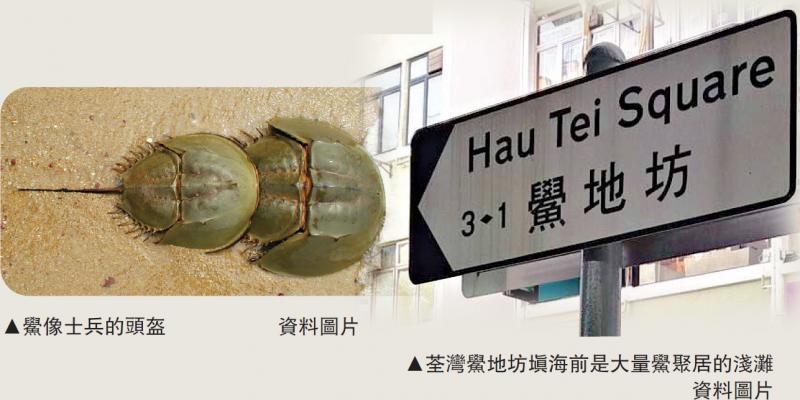 最近再觸發對鱟的興趣,因為聽說荃灣有一地方名叫「鱟地坊」,走遍港九大小地方,以鱟作地名的未有所聞,朋友說,「鱟地」成坊是好些年的事了,便好奇去看看,了解它與鱟的關係。上世紀初,荃灣是地處荒涼小村,四處淺草泥灘,鱟群聚居一帶淺海和泥灘,潮退時泥灘上爬滿鱟隻,令居民有些駭怕,人跡稀少,自然生態正常生長,荃灣成為鱟隻的天堂。其他地方如屏山白泥、大嶼山貝澳及水口、西貢、尖鼻咀也是鱟生活的地方,大量聚居;獨荃灣一地,當年村民將鱟群聚結的一處海灘稱為「鱟地」,無意識地記錄了四億年的生物在這地方生活過。上世紀七十年代填海取地,鱟居的泥灘填平成為市民生活的一角。