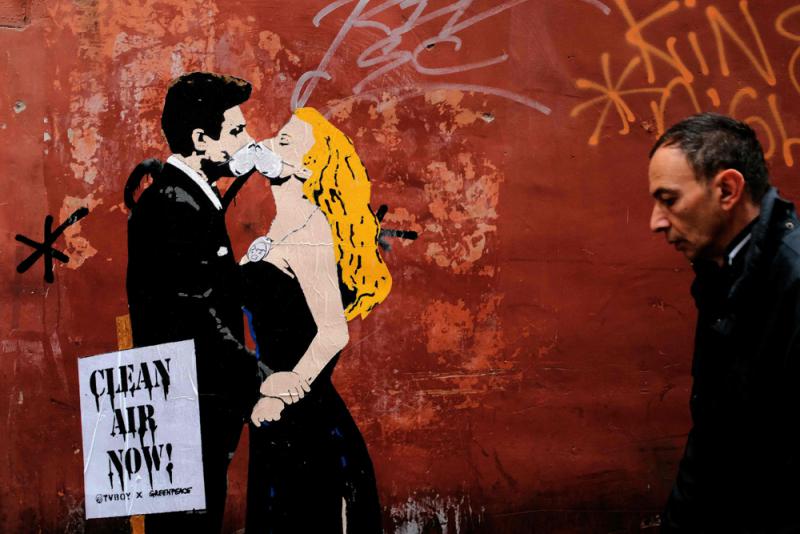 環保已成全球熱話,衍生了形形色色的活動,旨在提高大家關愛地球的意識。環保團體Greenpeace上月便聯同街頭藝術家TVBoy合作推廣「Clean Air Now」活動,在羅馬街頭不同的牆壁塗鴉,當中一幅圖畫的靈感源自經典意大利電影《露滴牡丹開》(La Dolce Vita)裏一場親吻戲,鬼馬的是,男女主角是戴上口罩的,目的是對空氣污染以及它對健康構成不良影響,作出控訴,並提出潔淨空氣的訴求。