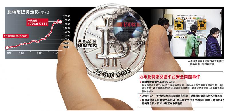 過去,不時傳出比特幣交易平台遭黑客攻擊的消息,其中一宗發生在2016年8月,香港的Bitfinex受到黑客攻擊,導致投資者損失約700萬美元。最為轟動的事件是發生在東京,曾是全球最大比特幣交易所Mt Gox在失去接近85萬個比特幣(時值約4.5億美元)後,於2014年宣布申請破產。市場人士稱,隨着比特幣價格持續攀升,加密貨幣交易所成為黑客最大攻擊目標,這些交易所需不斷加強安全功能。同時,美國證券交易委員會周二要求上市公司Crypto Company停牌,到2018年1月3日才恢復交易。該上市公司是金融科技概念股,近月股價勁升,由每股20美元狂升至約575美元,市值約119億美元。美國證交會表示,關注涉及市場操控情況。