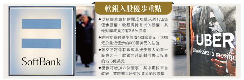經過數月艱難談判,軟銀(Softbank)投資網約叫車應用商優步(Uber)終於達成協議,據外媒報道,以軟銀為首的財團取得約17.5%優步股權,軟銀將持有15%股權,其他財團成員持有2.5%股權。該宗交易較優步最近的估值低約30%。/大公報記者 鄭芸央