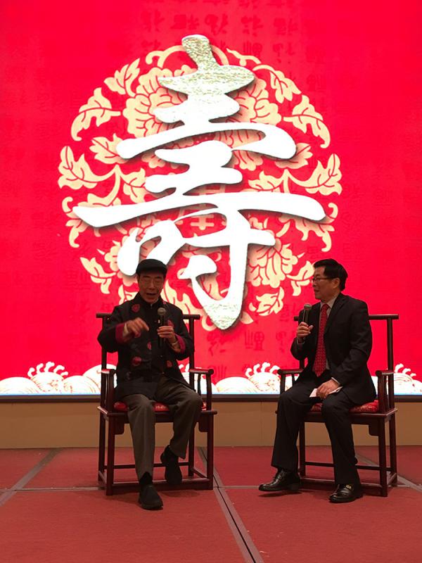 圖:楊孫西(左)在80歲壽宴上,與著名電視主持人劉瀾昌暢談,分享「活到老學到老」的人生態度