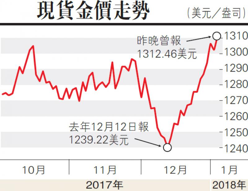 【大公報訊】金價在2018年首個交易日有個好開始,現貨金價周二升0.76%至每盎司1312.46美元,為去年九月二十六日以來高位。美國期金價格則曾微跌0.1%,每盎司報1308美元。金市交易員表示,強勁技術反彈推升金價,現貨金價主要阻力位於1311美元,支持位則為1300美元。