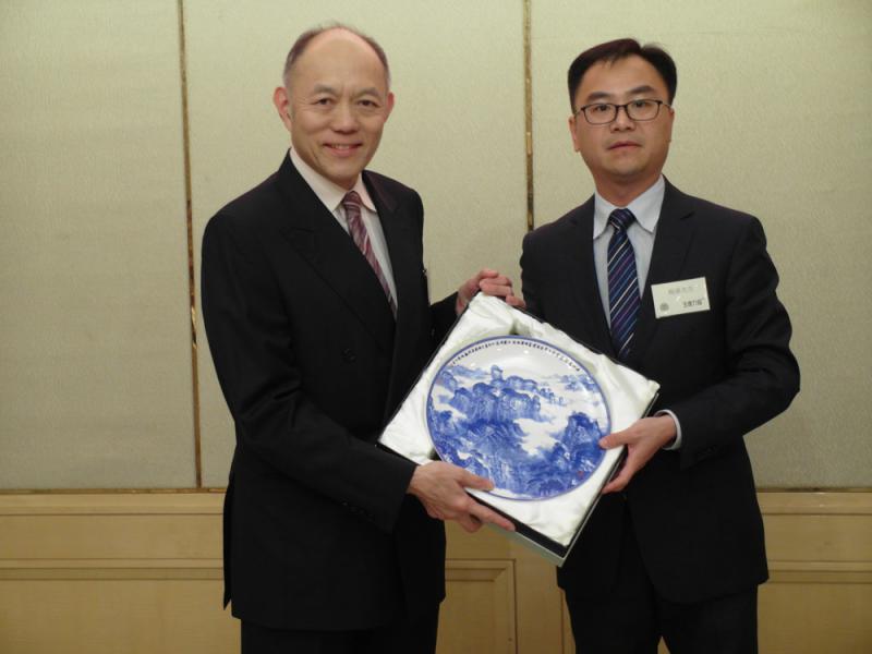 圖:楊軍(右)致送紀念品予霍震寰(左)\大公報記者徐曉彤攝