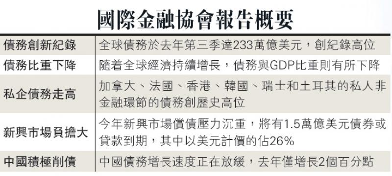 國際金融協會(IIF)最新發表的報告指稱,全球債務於去年第三季升至歷史新高,達到233萬億美元(約1817.4萬億港元),較2016年底增加16萬億美元,幸而由於全球經濟增長持續,加上中國和加拿大等致力減債,因而債務與國內生產總值(GDP)的比重連續第四季下滑,中國債務增速正在放緩。不過,該協會警告,今年新興市場償債壓力沉重,將有1.5萬億美元(約11.7萬億港元)債券或貸款到期。\大公報記者 鄭芸央