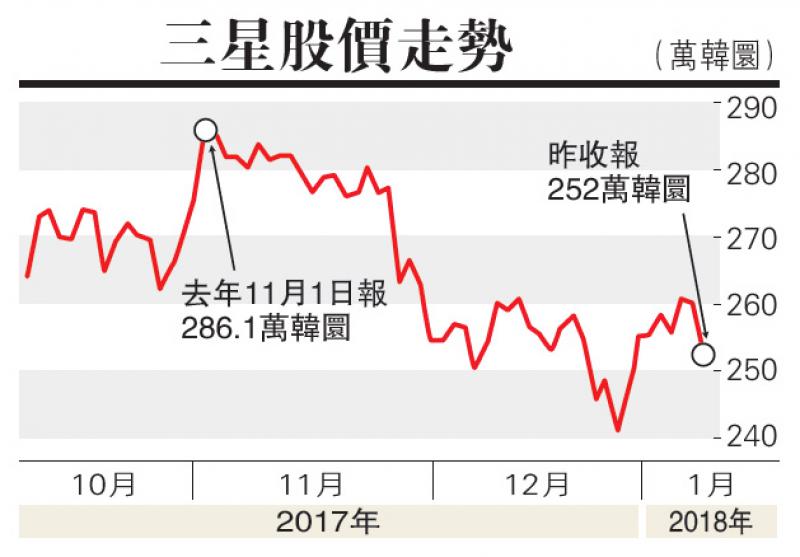 由於業績預測遜於預期,三星股價周二早段曾跌1.6%,至每股255.9萬韓圜,最終收報252萬韓圜,跌3.11%。去年十一月初,三星股價觸及高位後,自始由高位跌約9%,摩根士丹利調低對三星股票預測,理由是記憶晶片周期料見頂,以及智能手機市場放緩,當時投資者曾經擔心記憶晶片價格下跌。但是,三星股價去年全年升約40%,跑贏基準Kospi指數約22%的升幅。