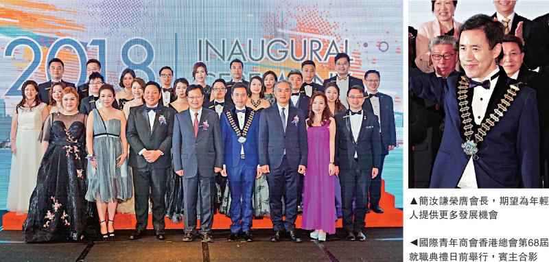 國際青年商會香港總會(總會)第68屆就職典禮日前舉行,簡汝謙榮膺會長。中聯辦副主任陳冬和消防處處長李建日應邀蒞臨主禮,來自菲律賓的國際青年商會2018年世界會長Marc Brian Lim亦親臨祝賀。簡汝謙致辭時表示,他將帶領總會與21個分會攜手向前,通過「十大傑出青年選舉」、「一帶一路國際青年論壇」等多個大型工作計劃,響應聯合國可持續發展目標,締造更美好香港,同時透過國際交流、合作及會議擴闊青年人的國際視野,致力培訓更多青年領袖以創造積極正面的改變。/大公報記者 伍聲