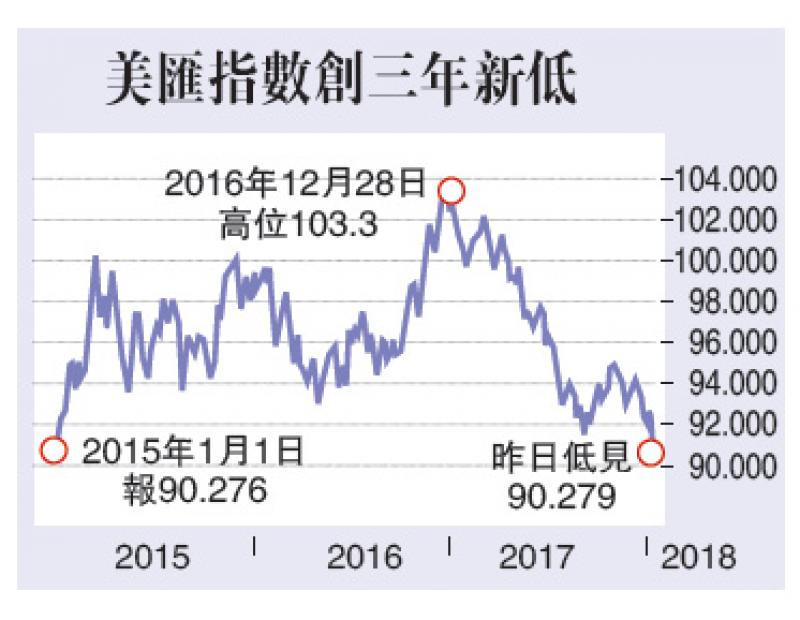 衡量美元兌六種一籃子主要環球貨幣的美匯指數,在歐洲交易時段曾跌至90.297的水平,為自從2015年1月15日以來最低。美匯指數其後略為回升至90.44,但較上周五收市位已下跌了0.65%。