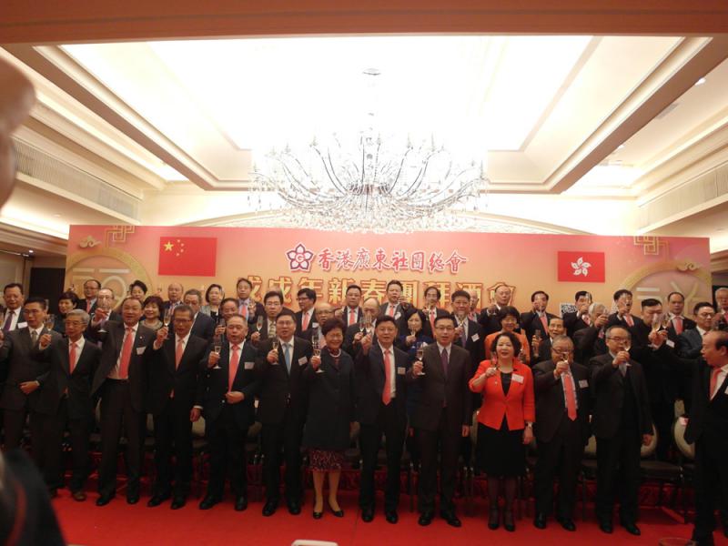 香港廣東社團總會日前舉行「戊戌年新春團拜酒會」,行政長官林鄭月娥、中聯辦副主任何靖、外交部駐港公署副特派員宋如安、廣東省委統戰部副部長李煥春和財政司司長陳茂波等共同主禮。總會主席梁亮勝致辭時表示,願以香港所長,配合國家所需,為國家和香港發展作出新努力,特別是融入大灣區建設,為港發展增添新動力。/大公報記者 徐曉彤(文/圖)